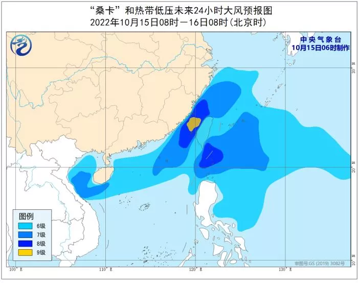 在陆地被冷空气控制的同时,我国南部海区风力也逐渐加大。受今年第19号台风“桑卡”和菲律宾以东洋面的热带低压共同影响,15日,南海东北部、台湾海峡、巴士海峡部分海域、福建中部沿海、台湾岛西部和东南部沿海的风力8-9级,阵风10-11级。中央气象台今晨同时发布台风蓝色预警和海上大风黄色预警。 图片来源:中央气象台网站