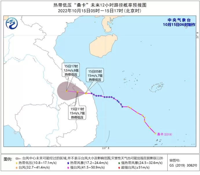 今年第19号台风“桑卡”于昨日(14日)下午生成,今天凌晨3时前后在越南广义省安海市沿海一带登陆,登陆时强度为热带风暴级(8级,18米/秒),中心最低气压为998百帕。登陆后,“桑卡”在越南境内减弱为热带低压。预计,“桑卡”的中心将以每小时15公里左右的速度向偏西方向移动,强度逐渐减弱。 图片来源:中央气象台网站