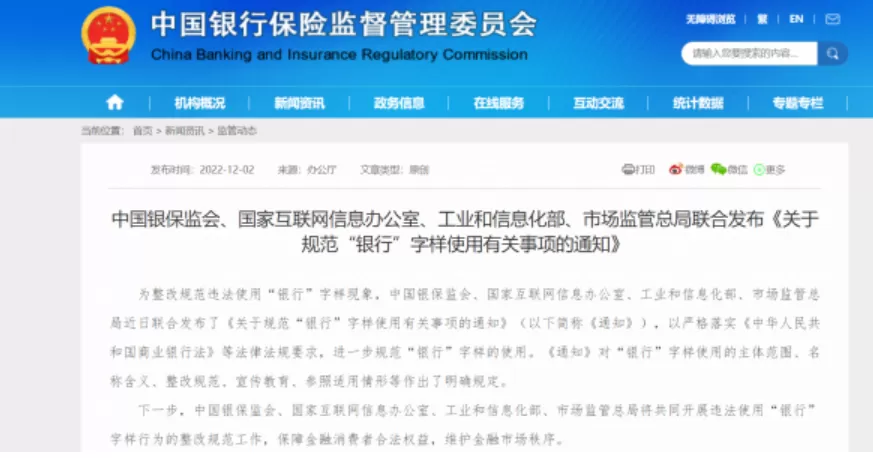 四是提出银行保险机构的报告及审查要求。要求各银行保险机构发现违法使用"银行"字样情况的,应当及时向银保监会或其派出机构报告。对于违法使用"银行"字样的主体,各银行保险机构不得为其业务系统开发提供技术支持,不得与其开展营销推广方面的业务合作;在提供授信、承保等金融服务时,应当对其整改情况进行必要审查。 有关部门负责人表示,当前,存在一些并非从事金融业务的工商企业使用如"时间银行""粮食银行"等"银行"字样的情况,实际上相关名称完全可以用"宝库""仓库"等其他名称替换,既满足合规要求,也不影响正常业务的开展。目前,浙江等地方已经开展了"两山银行"等摘牌和更名工作,整改进展顺利。 此外,《通知》指出,违法违规使用"总行""分行""支行""农商行""城商行""农村信用社""城市信用社""储蓄所""资金互助社"等字样,仿冒银行机构营业场所装潢、网站外观、移动互联网应用程序外观和标志等情形,欺骗或者可能误导金融消费者的,参照《通知》要求进行整改;构成不正当竞争行为的,依据《反不正当竞争法》有关规定进行行政处罚。 有关部门负责人指出,《通知》发布后,存在违法使用"银行"字样的主体应主动及时更名。对于违法行为轻微并及时改正等情形的,可以依法免予处罚。同时,各银保监局将积极协调并会同网信部门、电信主管部门、市场监管部门共同开展整改规范工作,严格落实合规要求。 天无不散之席,本篇"“银行”字样不能乱用"就介绍到这了。这次小编是参考了一些网络资料,可能有不正确的地方,大家理性参考。看完文章,大家有是不是有不同的看法呢?看完这篇文章,如果还不过瘾的话,可以继续下一篇哦! |