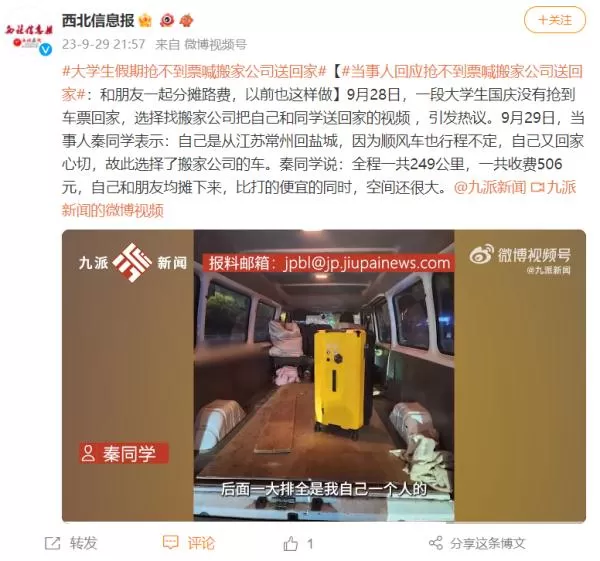9月29日,当事人秦同学表示,自己是从江苏常州回盐城,因为抢不到高铁票,想搭顺风车也因坐满员没挤上,自己又回家心切,无奈之下只能选择货拉拉搬家公司的车。 秦同学说,由于提前无法确定学校放假时间,所以就和朋友两人临时叫车回家了。 秦同学告诉记者,一个行李,两个人,全程249公里,总共收费506元,里面还包含他给司机的小费;虽然价格比高铁票价略高,但分摊下来还可以。