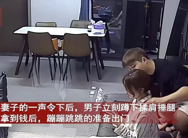 妻子坐了起来,看样子对这种情况,已经习以为常,她声音平静地问老公:多少钱? 男子老老实实地回答:200! 女子不作声,坐直身子,低声地男子说:求我! 男子立马会意,满脸堆笑,蹲下身子,开始给老婆捶腿。 接下来又给老婆按摩腿和脚,这还不够,男子又跳上沙发,蹲在老婆身后,贴心地为她按摩背部。