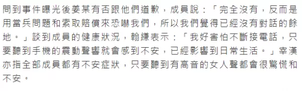 被问到事件曝光后,姜代表是否跟他们道歉,成员们表示不但完全没有道歉,反而用索取赔偿来恐吓他们。