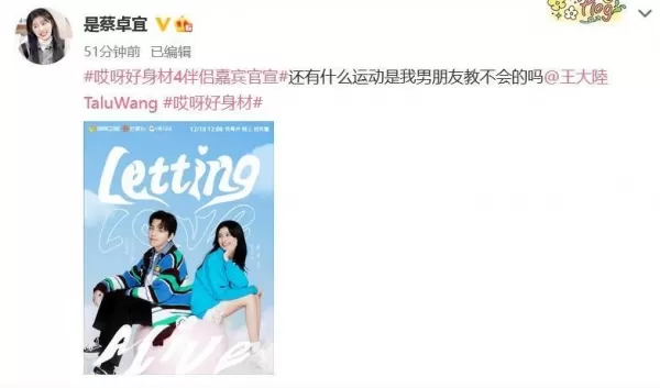 王大陆晒出二人的节目合照,写道:"还有什么运动是我女朋友练不好的吗?" 蔡卓宜也晒出合照称:"还有什么运动是我男朋友教不会的吗?" 二人还相互@对方,大方官宣恋情,还顺带宣传参加综艺节目。