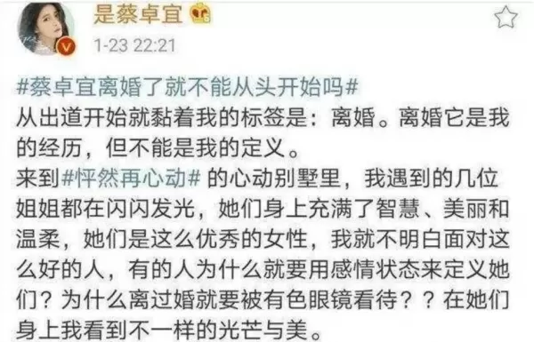 2021年初,蔡卓宜参加恋爱综艺《怦然再心动》,发文再次回应离婚一事,王大陆当时是该节目的恋爱助理。